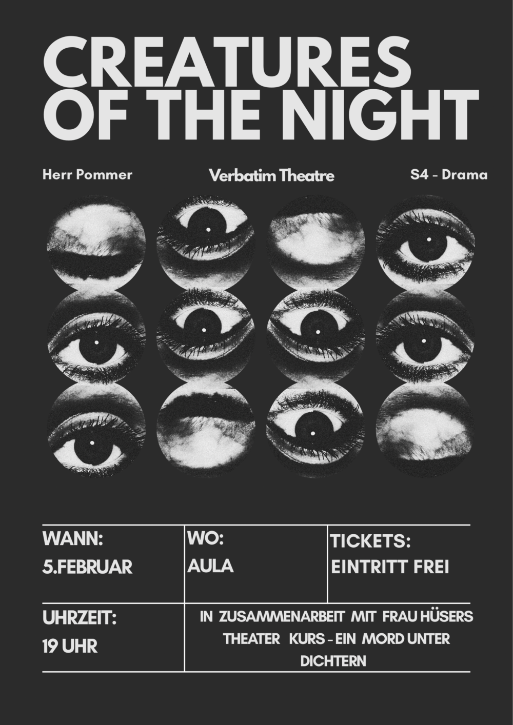 Der Dramakurs zeigt das selbstentwickelte Verbatim-Theatre-Stück „Creatures of the Night“. Ausgangspunkt waren Interviews zum Thema Nacht: Die Schüler*innen haben mit Menschen gesprochen, deren Leben, Arbeit oder Erleben sich nach Einbruch der Dunkelheit entfaltet, darunter Polizist*innen, Pflegekräfte oder Nachtschwärmer. Aus diesen Gesprächen sind authentische Szenen entstanden, die von nächtlicher Arbeit, Feiern, besonderen Begegnungen und der leisen Melancholie des Mondlichts erzählen. Alle auf der Bühne gesprochenen Texte sind originale Worte realer Menschen. Die Aufführung ist zweisprachig auf Deutsch und Englisch.