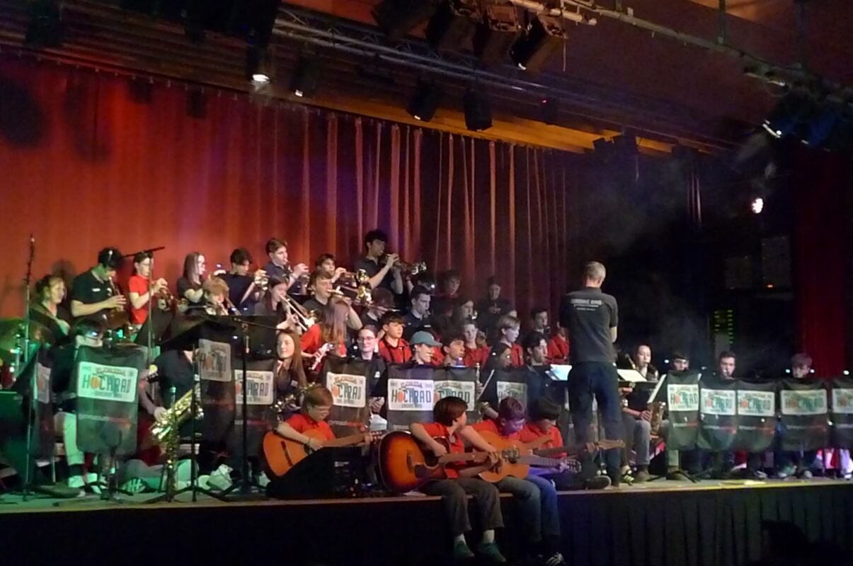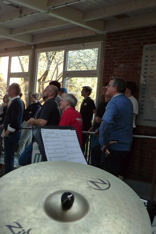 Los ging’s mit einem Festakt in der Pausenhalle. Der erste Leiter Steffen Alberti sowie die aktuellen Leiter Steffen Merkel und Sebastian Korff blickten mit viel Witz und einigen charmanten Anekdoten auf 20 Jahre Bandgeschichte zurück. Viele Ehemalige und Eltern waren dabei.