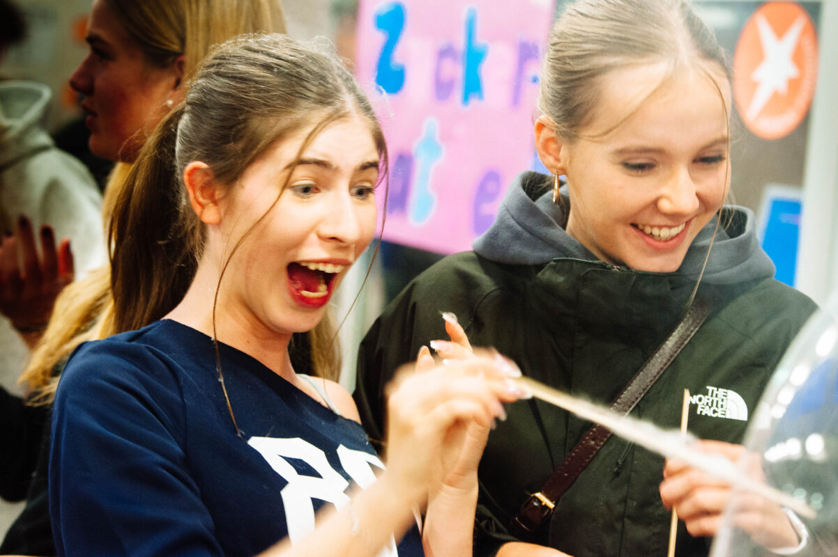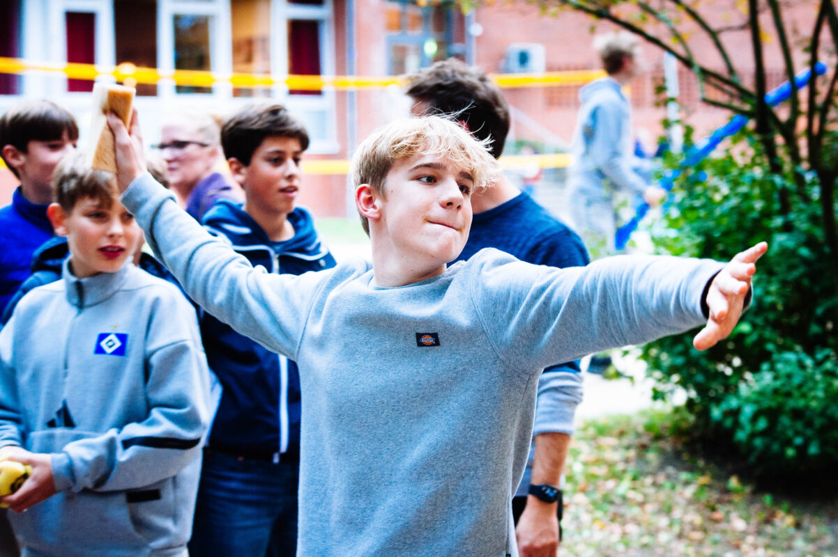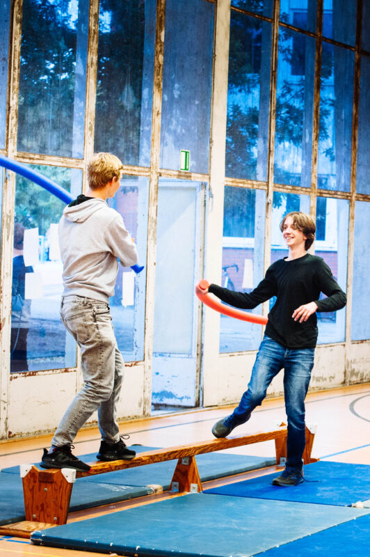 In der Sporthalle gab es u.a. einen lustigen Parcours, den man mit einem Steckenpferd bewältigen musste und umgedrehte Bänke, auf denen man mit einer Schwimmnudel gegeneinander antreten konnte. Wer behält das Gleichgewicht beim Schimmnudel-Kampf und wer fällt runter? Kinder haben dort gegen ihre Eltern gekämpft oder auch Schüler und Schülerinnen gegen Lehrkräfte. Das war sehr spaßig.