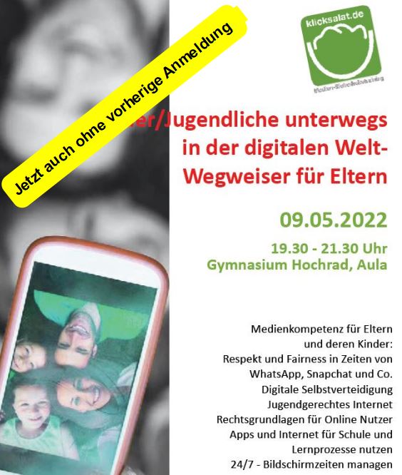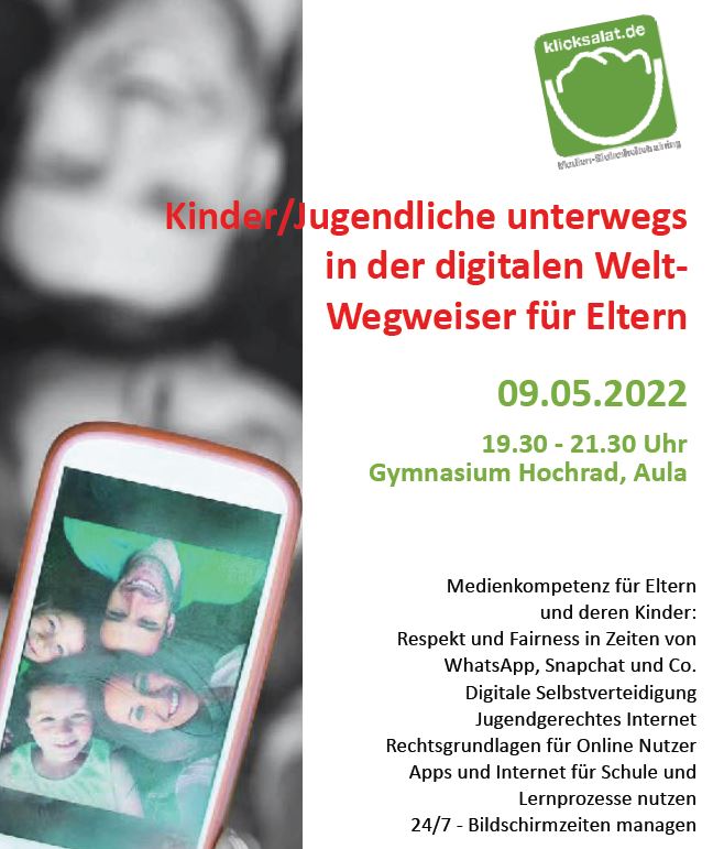 Dieser Elternabend hilft Eltern, sich zu informieren und zu orientieren, die richtigen Fragen zu stellen und die nötigen Grenzen zu ziehen. Die Schule konnte Herrn Jörg Kabierske von Klicksalat als Referent gewinnen, der uns mit seiner fast 20-jährigen bundesweiten Erfahrung von Vorträgen und Workshops mit über einer halben Millionen Schülern, Eltern und Lehrern an 1000 Schulen zur Seite stehen wird.