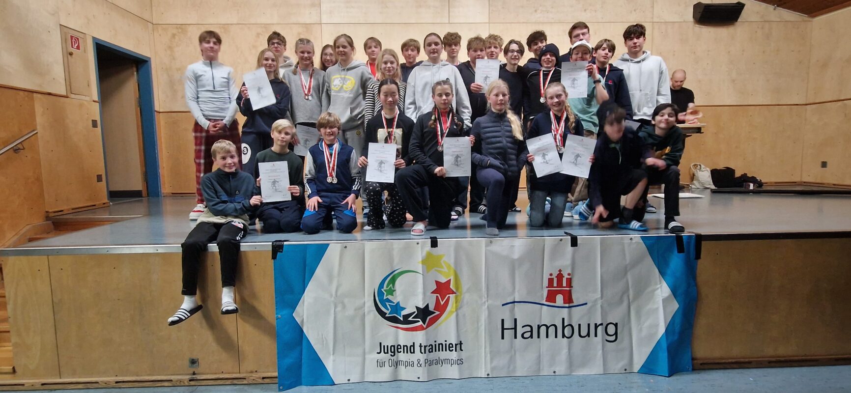 Nach dem ersten Wettkampftag führte das Gymnasium Blankenese deutlich vor dem Gymnasium Hochrad und der Stadtteilschule Fischbek Falkenberg (Fifa). Im Staffelrennen entwickelte sich dann ein wahrer Krimi: FiFa startete eine beeindruckende Aufholjagd und kämpfte sich bis an die Spitze heran. Der große Rückstand aus Tag eins ließ sich jedoch nicht wettmachen. In der Gesamtplatzierung konnte Gymnasium Blankenese den ersten Platz halten, gefolgt vom unserem Team. Damit konnte sich das U14-Team vom Gymnasium Hochrad zum 2. Mal in Folge für das Bundesfinale qualifizieren!